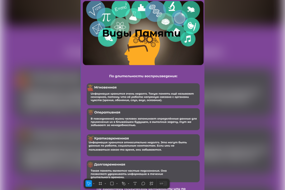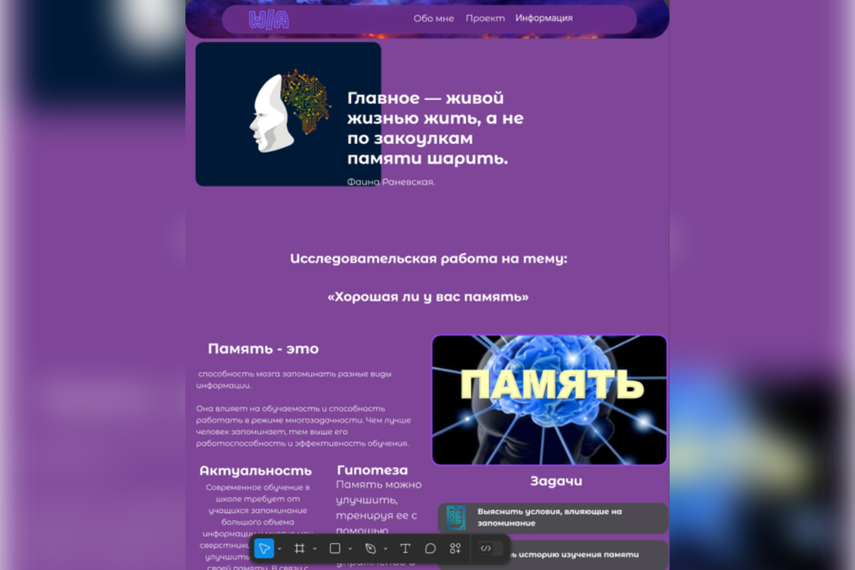 В проекте создан веб-сайт на тему «Хорошая ли у вас память». В своей работе я почувствовал себя веб-дизайнером (UX/UI) и frontend-разработчиком и могу с уверенностью сказать, что в будущем я хочу связать свою жизнь с веб-разработкой, так как это довольно интересный и можно сказать захватывающий опыт.