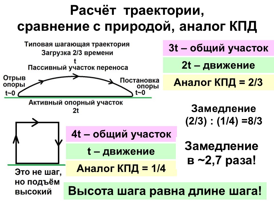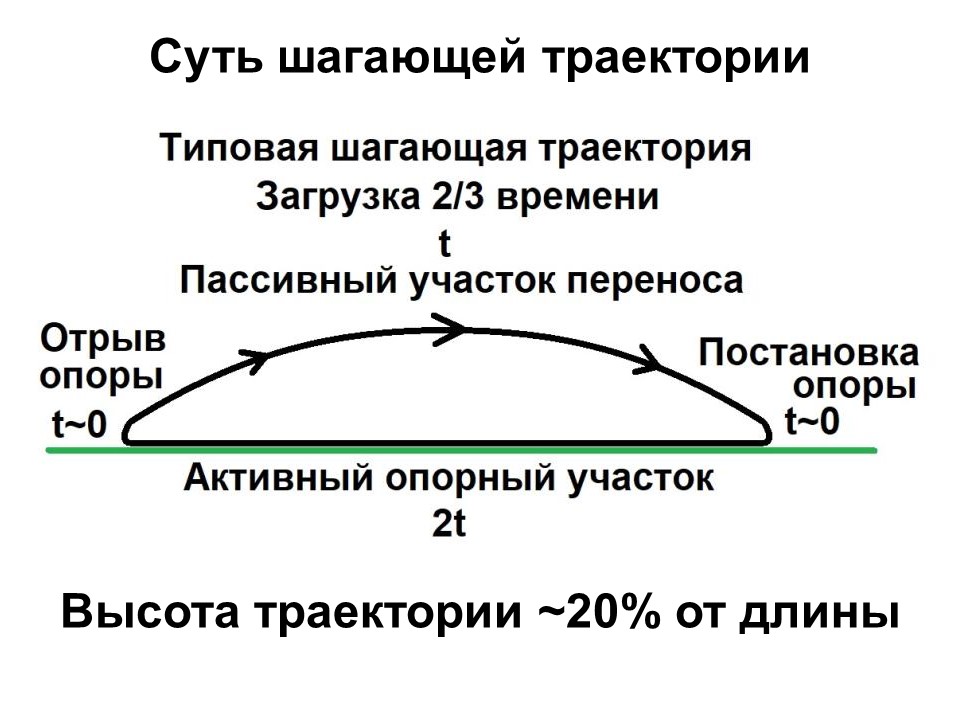 Природная шагающая траектория состоит из четырёх участков. На активный участок приходится приблизительно 2/3 времени, на перенос опоры 1/3. Такое соотношение характерно для всей живой природы. Например, по такому же ритму работает сердце человека: систола, диастола, пауза. Это соотношение изучал Николай Иванович Иванцик при создании медицинских механизмов. Новизна этой работы заключается в исследовании двух участков траектории, почти мгновенных, на которые обычно не обращают внимания. Однако именно на этих участках человек спотыкается.