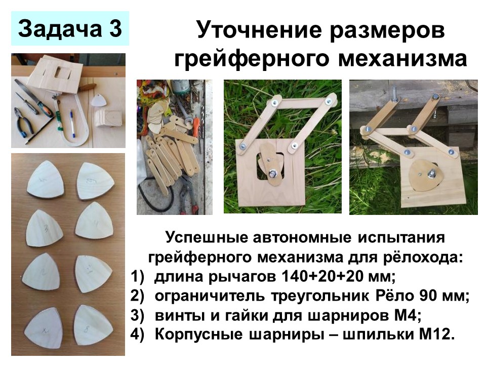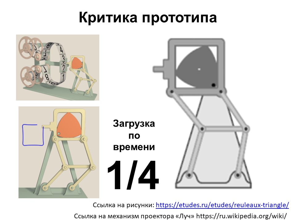 В качестве прототипа для новой шагающей машины был выбран грейферный механизм, причём простейший, от кинопроектора «Луч». Этот механизм основан на кривой постоянной ширины, на треугольнике Рёло. Однако сразу появилась трудность. Продолжительность активного участка всего 25% времени цикла. Для постоянной опоры понадобится, как минимум, четыре механизма. Но ведь автомобиль тоже на четырёх колёсах. Потребовалось провести эксперимент.