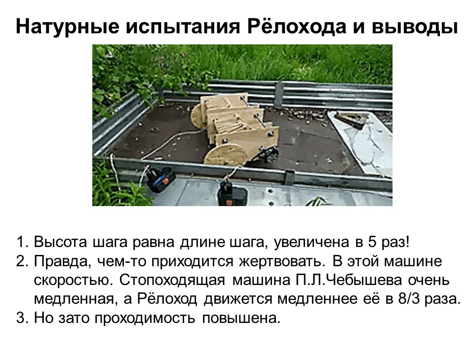 Натурные испытания доказали правильность предложенного технического решения. Мотоблок из двух сборок по 4 механизма способен поворачивать, изменять направление движения. Высота шага большая, 50 мм при теоретической ширине кулачка Рёло 70 мм, но практической детали 50 мм. Высота шага равна длине шага. Правда, чем-то приходится жертвовать. В этой машине скоростью. Стопоходящая машина П.Л.Чебышева очень медленная, а Рёлоход движется медленнее её в 8/3 раза. Но зато проходимость повышена.
