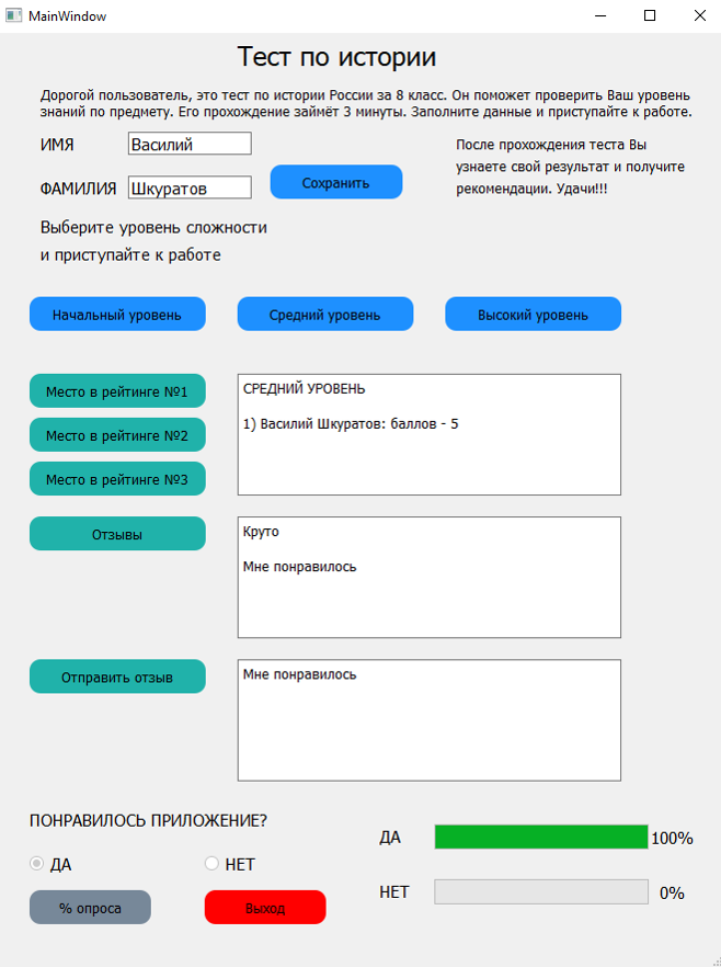 Реализация. Приложение состоит из четырёх окон: главное и три с тестовыми заданиями, которые открываются и закрываются при нажатии на кнопку. Класс «Ui_History_test» – главное окно. Класс «Ui_Test_one» – тест начального уровня. Класс «Ui_Test_two» – тест среднего уровня. Класс «Ui_Test_three» – тест высокого уровня. В программе используются пять файлов: три – для записи и отображения рейтинга (result1.txt, result2.txt и result3.txt ), для отзывов и для «процента опроса». В приложении реализованы разные функций: для проверки ответов пользователя и вывода баллов (функция - vivod), для записи и чтения из файлов (функции – web, fort, ioi, joj и другие), для открытия окон (функции – open, open1) и другие. В программе есть три текстовых поля (textEdit, textEdit_2, textEdit_3); три строки ввода (две для имени и фамилии «name и surname», одна – для ввода ответа в тесте высокого уровня «lineEdit»; кнопки QPushButton, QRadioButton.